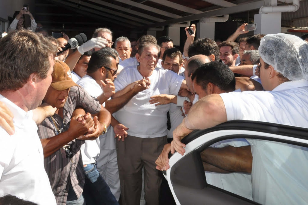 - João de Deus, na 1.a aparição pública em Abadiânia, cercado por funcionários do Centro Espírita (FOTO: Folhapress)