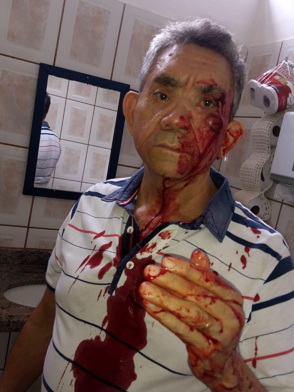 Atingido por socos e por um caderno jogado pelo aluno, professor Paulo ficou bastante machucado, está com sangue pisado no olho esquerdo, mesmo lado em que levou 6 pontos cirúrgicos para fechar ferimento na face e outros 2 no supercílio, fora hematomas. “Estou horrorizado”, disse. “Já estava decepcionado com a falta de respeito dos alunos, mas essa agressão foi demais”.
