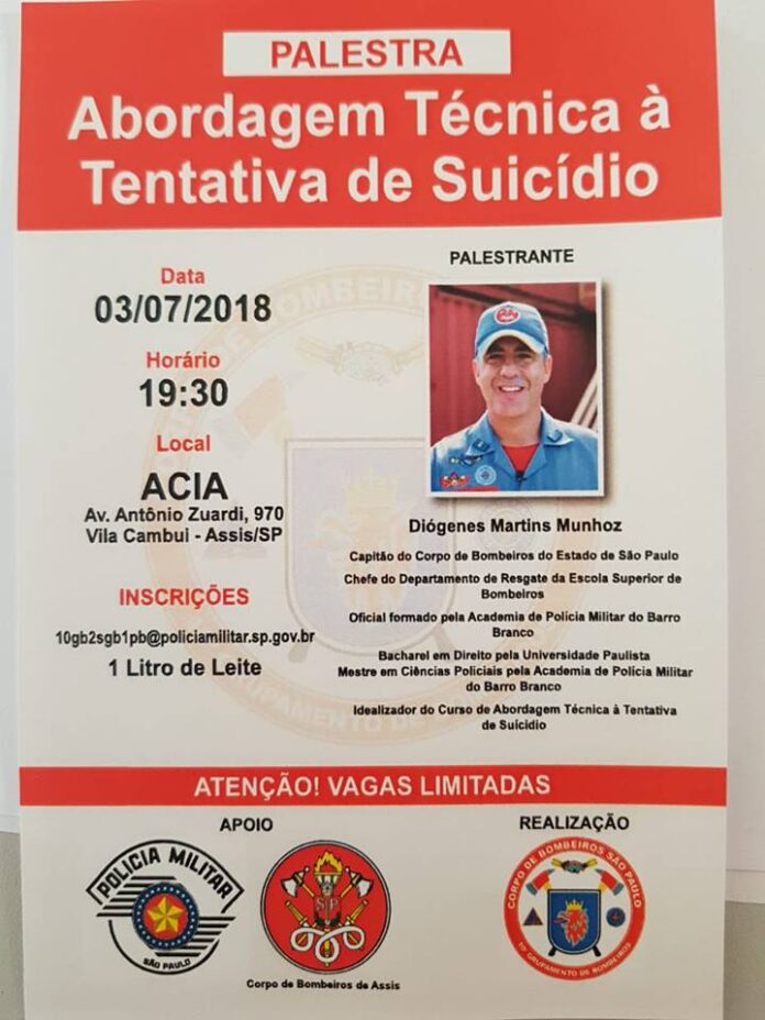 Em Assis, onde o problema também é crescente, o Capitão do Corpo de Bombeiros Diógenes Martins Munhoz fará a palestra ‘Abordagem Técnica à Tentativa de Suicídio’, dia 3, 19h30. A entrada será um litro de leite longa vida. Munhoz é chefe do Depto. de Resgate da Escola Superior de Bombeiros, bacharel em Direito e idealizador do curso de abordagem a suicidas.