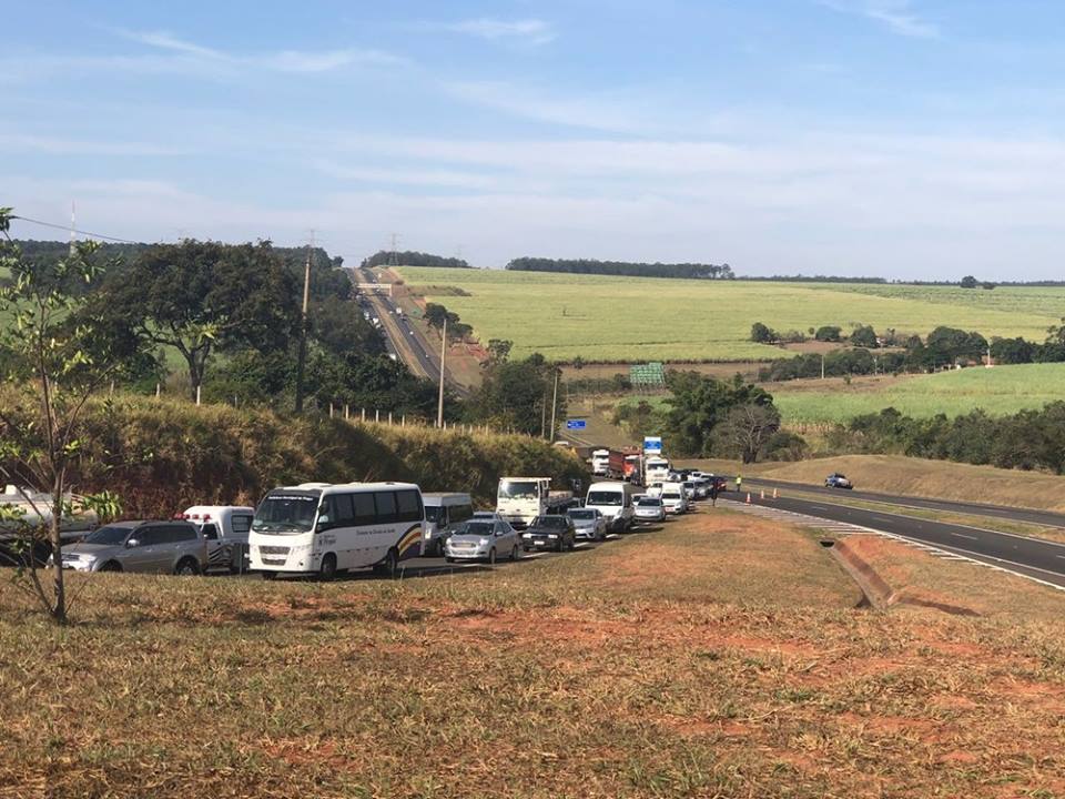 (FOTOS: Giuliano Tamura/TV Tem/Reprodução – Congestionamento foi imenso após caminhão-tanque vazar combustível na pista: colisão traseira)