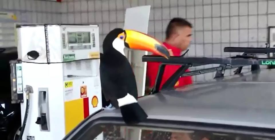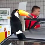 (FOTOS: Arquivo Pessoal/Divulgação – Tucano ‘Tutu’ bebe água na torneira da pia do posto de combustíveis, onde também encontra o amigo Jr Gaiato e observa o serviço dos funcionários)