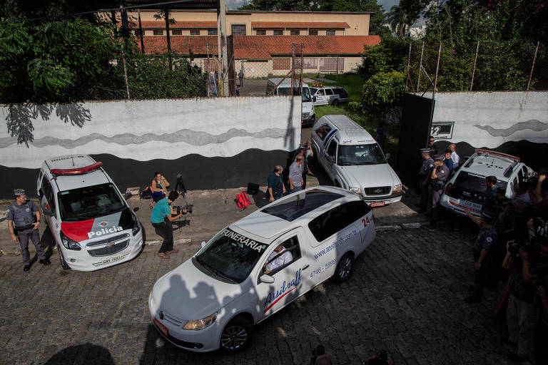 - Carros funerários quando deixavam escola, onde recolheram corpos: tristeza (FOTO: Folhapress/Reprodução)