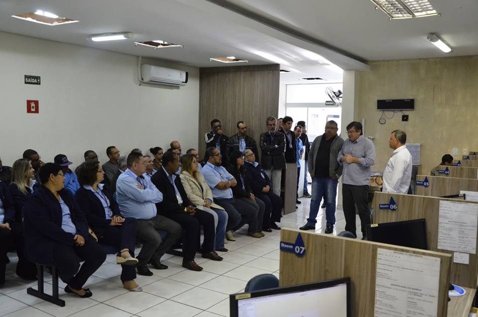 (FOTO: Divulgação/PMM – Daniel e o vice Tato em reunião com funcionários do DAEM, na presença do presidente Marcelo de Macedo: autarquia não será concedida, garante)