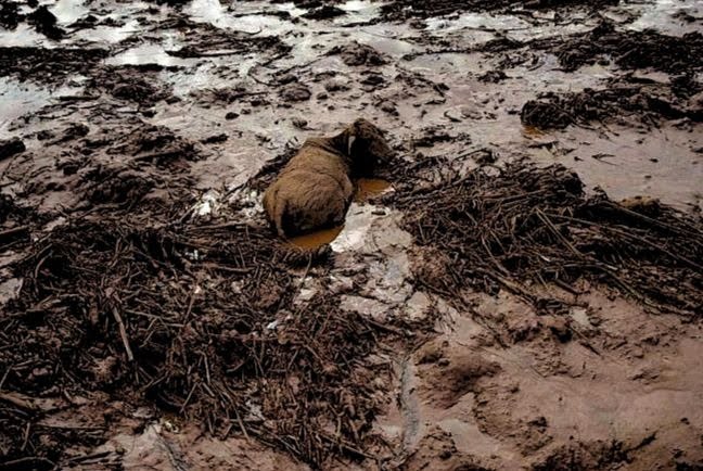 - Além de pessoas, animais também estão presos no mar de lama que vazou da barragem (FOTO: R7/Reprodução)
