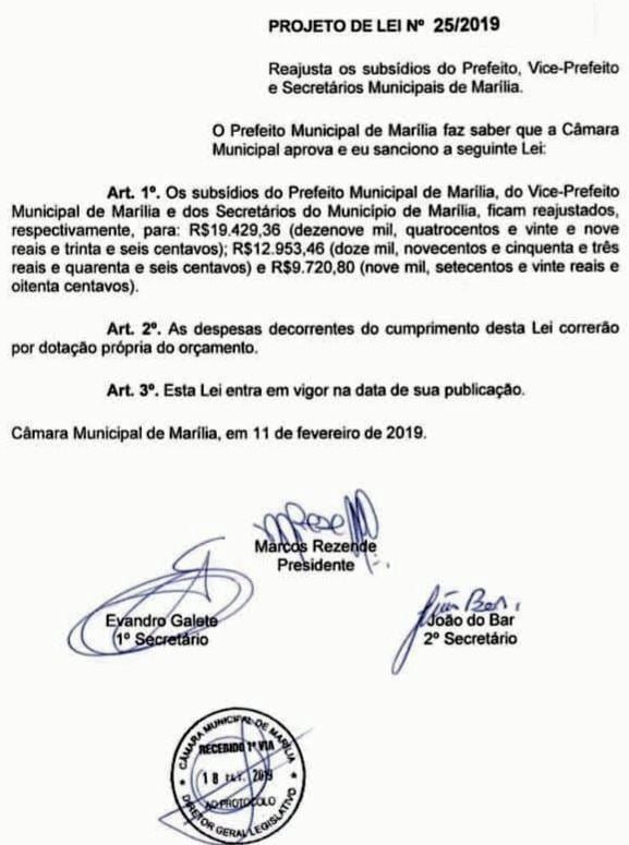 Projeto de Lei nº 25/2019, autoria da Mesa da Câmara, reajusta os salários do prefeito, vice e secretários municipais de Marília. A matéria foi protocolada na 2a feira (18) e segue tramitação ordinária na Casa, sem urgência, podendo ser consultada no site oficial do Legislativo (marilia.sp.leg.br).