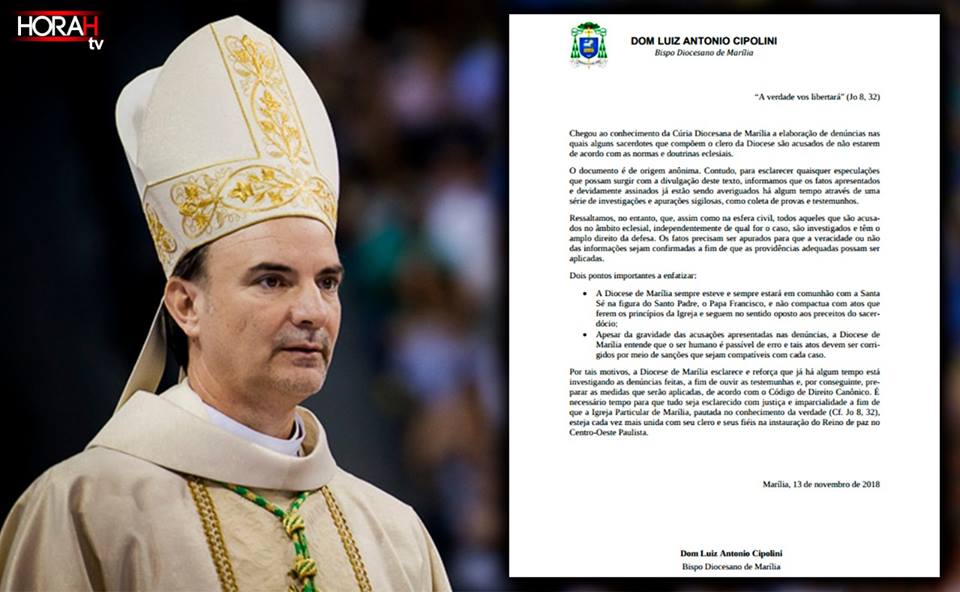 O caso é tão grave que em documento oficial datado do dia 13, o bispo Dom Luiz Cipolini cita as denúncias contra “alguns sacerdotes” acusados de violar “as normas e doutrinas eclesiais”. Apesar de observar que se trata de ‘documento de origem anônima’, apressa-se para esclarecer que tais ‘especulações’ (forma como se refere às denúncias) “já estão sendo averiguadas há algum tempo”, mas que são “apurações sigilosas, como coleta de provas e testemunhos”.