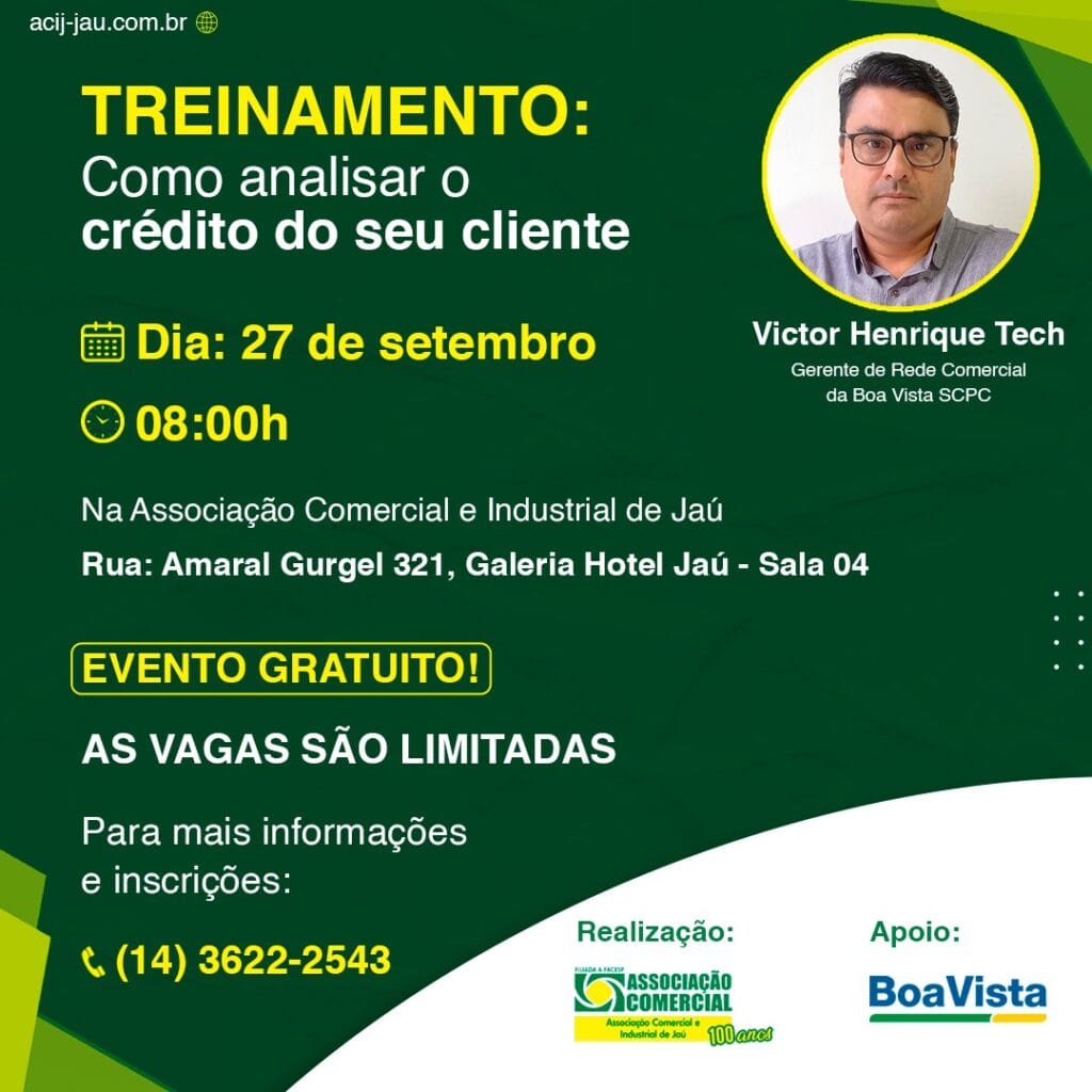 Isso inclui folha de pagamento, fornecedores e colaboradores, tudo o que a Associação Comercial e Industrial de Jaú (ACIJ), com o intuito de minimizar as chances dessas ocorrências, estará oferecendo aos empresários com o treinamento “Como analisar o crédito do seu cliente”. A iniciativa conta com palestra de Victor Henrique Tech, Gerente de Rede Comercial da Boa Vista SCPC, parceira do evento.