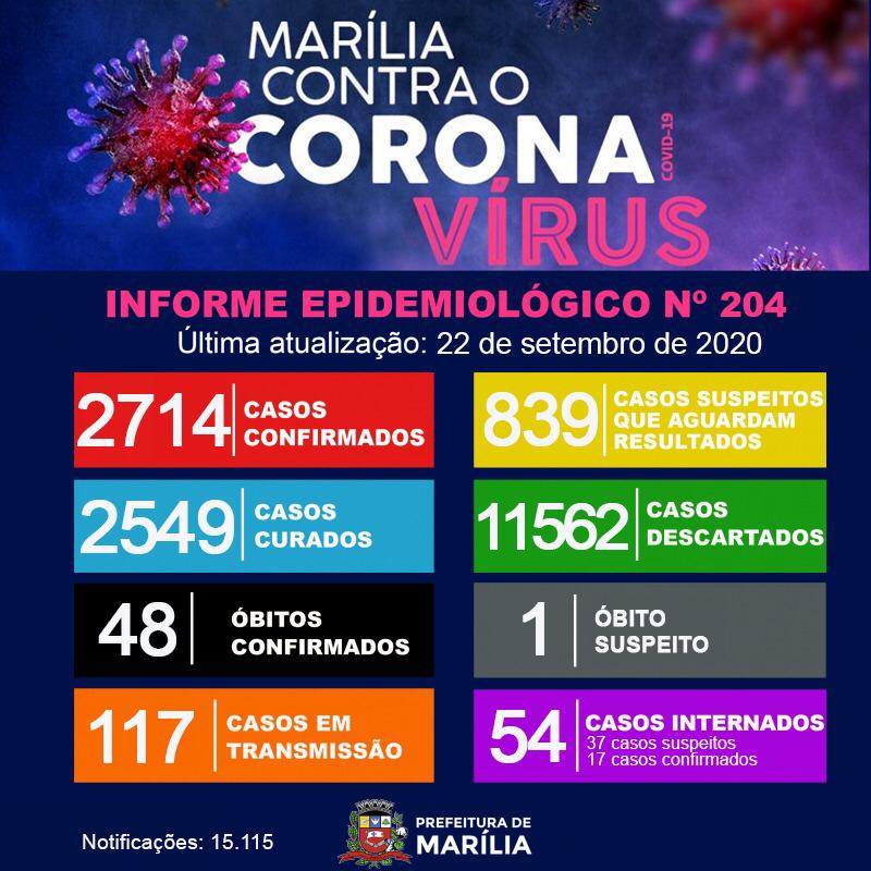 Marília registrou nas ultimas 24 horas mais 59 casos do Covid-19 e chegou a 2714. A cidade ainda tem 839 pessoas com suspeitas do Novo Coronavírus que aguardam resultados de exames, 48 óbitos confirmados e um em investigação.