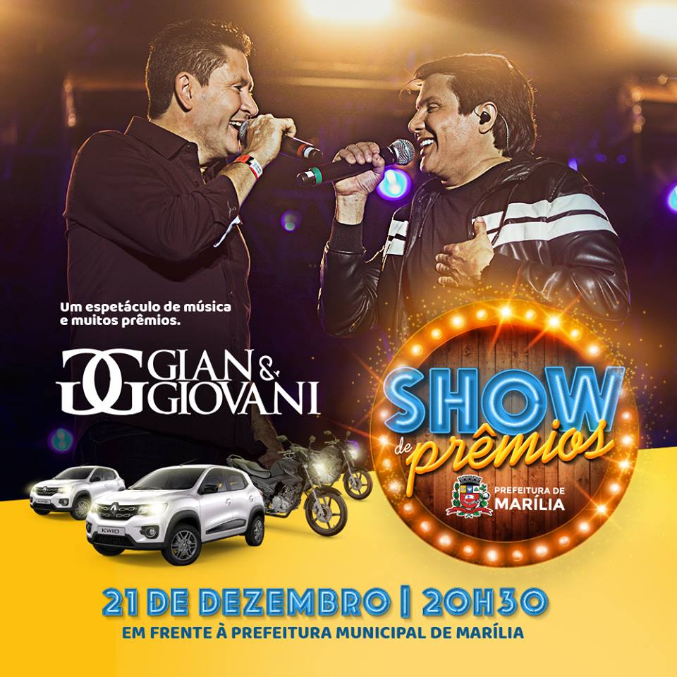 PRÊMIOS – Serão sorteadas em praça pública, em frente à Prefeitura, 2 motos Yamaha Factor 150 ED Flex zero km e 2 Renault Kwid Life 1.0 também zero km. Os prêmios serão entregues em até 60 dias após o sorteio. Logo após o IPTU premiado, haverá show com a dupla sertaneja Gian e Giovani. O evento terá início às 20h30.