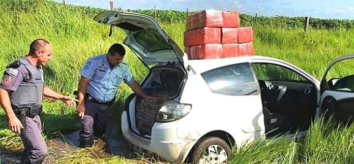 - Carro foi abandonado em meio a um lamaçal e o motorista fugiu a pé (FOTO: Polícia/Divulgação)