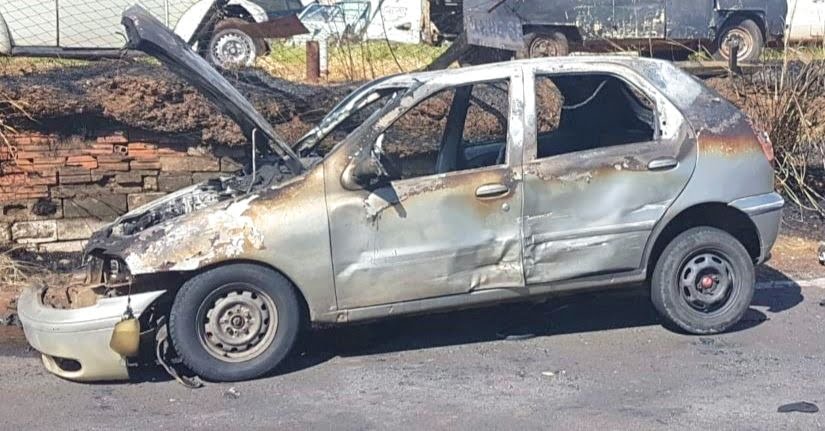 - Carro consumido pelo fogo em Marília (FOTO: Brunno Alexandre/MaríliaNotícia / Reprodução)