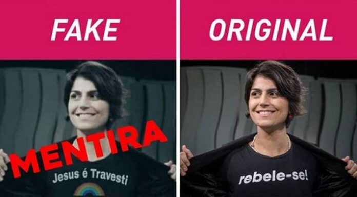 (FOTO: Internet/Reprodução – Foto de Manuela com camiseta original à direita e montagem com a frase falsa à esquerda: uma das dezenas de fake news contra a candidata)