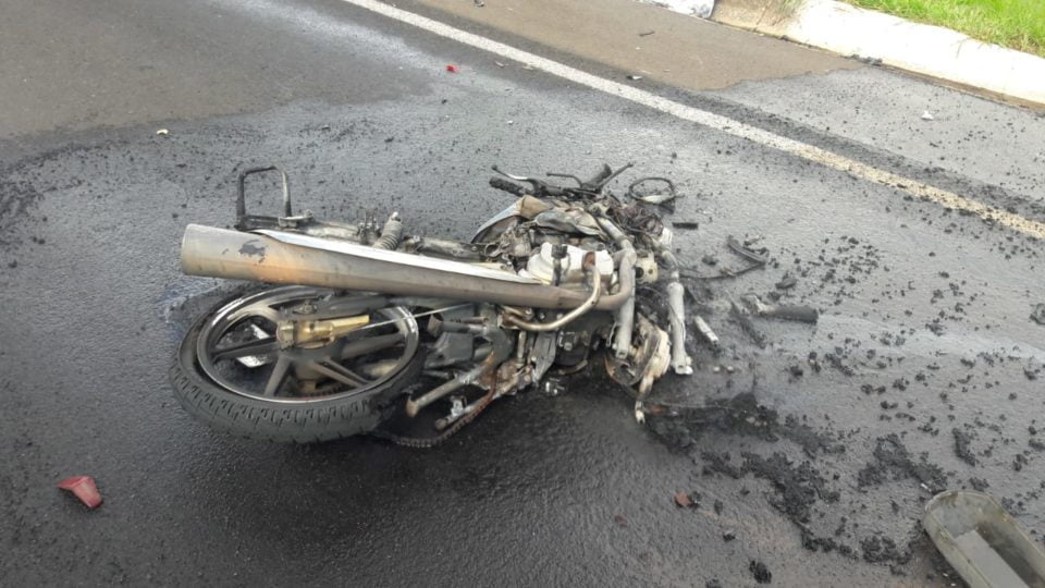 - Com a força da colisão frontal, moto se partiu e pegou fogo (FOTO: Divulgação/Polícia Rodoviária)