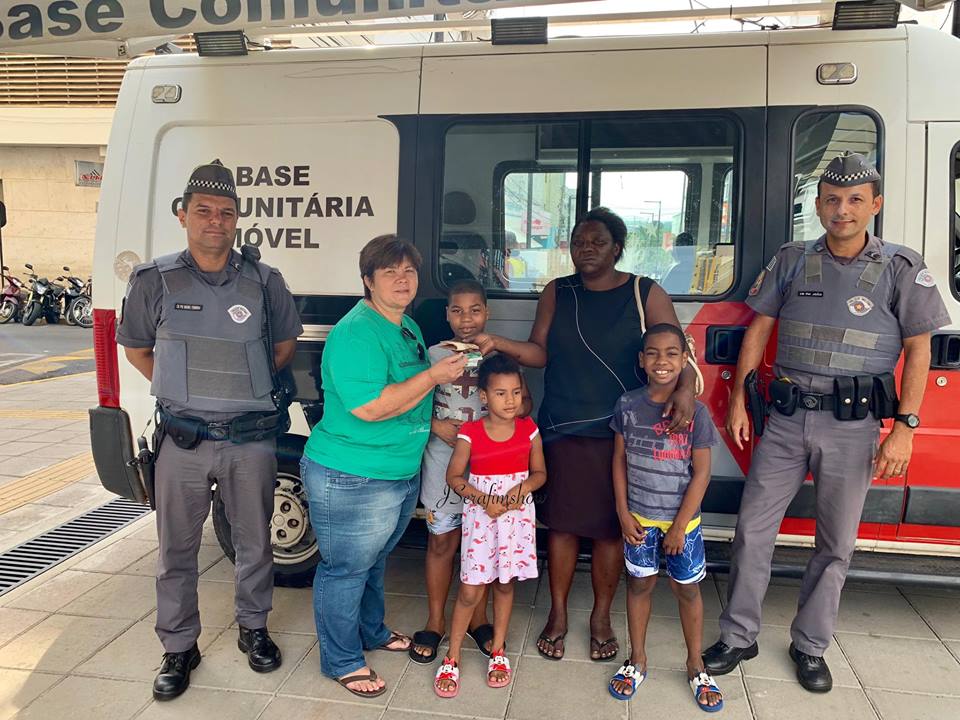 - Simone com 3 dos 7 filhos, ao devolver carteira à dona em Lins: ajuda dos PMs para localizar Liliane (FOTO: J.Serafim/Reprodução)