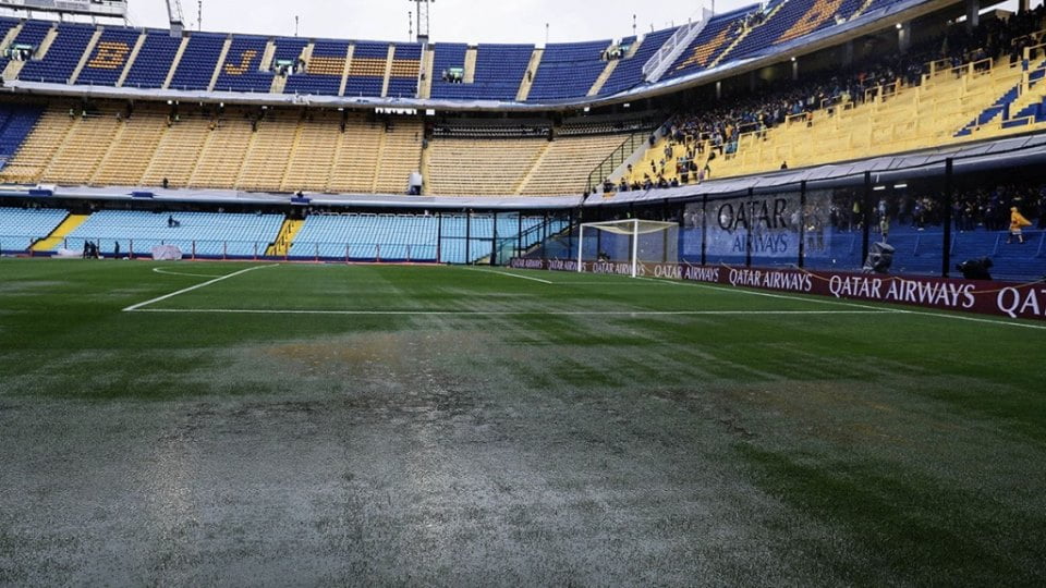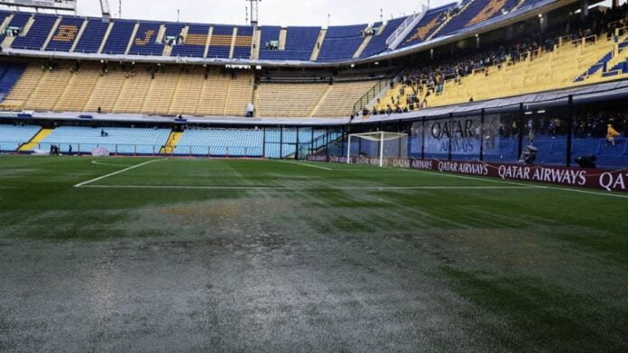 (FOTO: Twitter/Reprodução – Gramado da Bombonera ficou alagado)