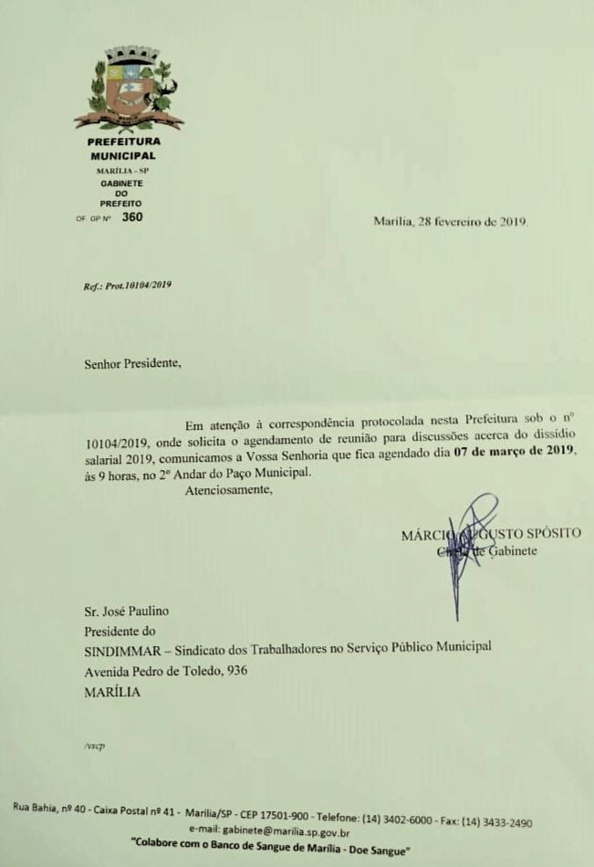 Primeira reunião oficial entre representantes do Sindicato dos Servidores de Marília (Sindimmar) e Prefeitura foi marcada para a 5a feira (7). Será às 9h, no auditório do Paço, instalado no mesmo piso do gabinete do prefeito Daniel Alonso. Confirmação do encontro foi assinada pelo chefe de gabinete Márcio Spósito.