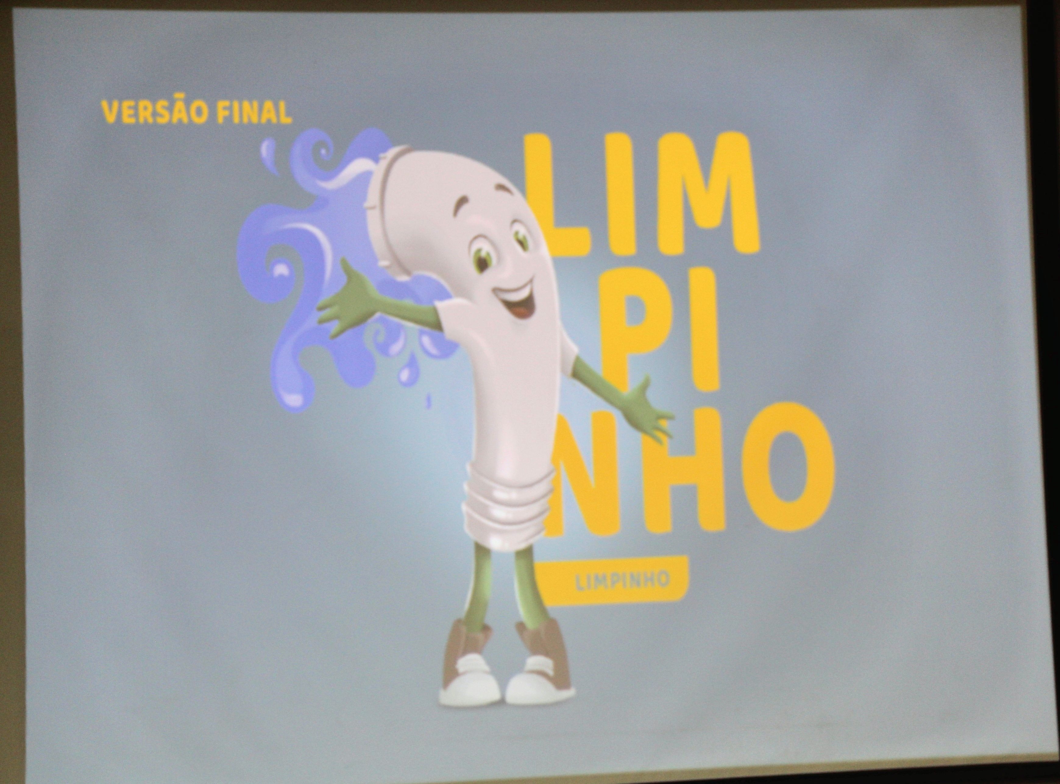 - A versão final da mascote Limpinho, exibida no telão do evento (FOTO: HoraH/Reprodução)