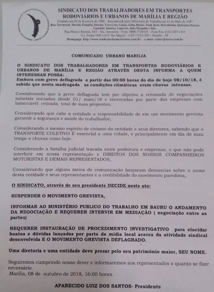 O comunicado lembra que a greve tem objetivo de forçar as empresas Grande Marília e Viação Sorriso a retomar negociações salariais encerradas em 19/9, unilateralmente. Por fim, diz que informou a decisão ao Ministério Público do Trabalho (MPT) e pediu para “intervir em mediação (negociação entre as partes)”.