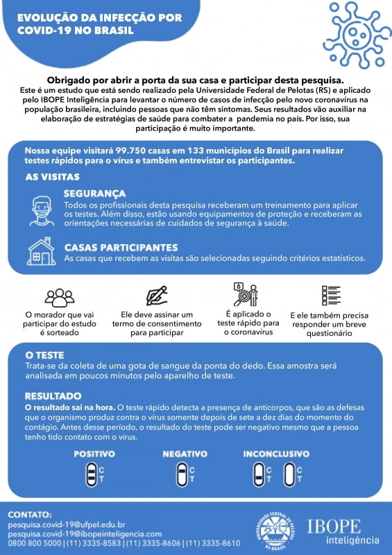 A pesquisa é parte de um estudo desenvolvido pela Universidade Federal de Pelotas (RS) para identificar o número de casos de infecção pelo Novo Coronavírus na população brasileira. Além de Marília, outras 132 cidades do Brasil participam deste levantamento. No total serão realizados os testes em 99.750 casas em 133 municípios do Brasil.