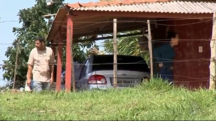(FOTOS: TV Tem/Reprodução – Corpo de Luciana estava dentro do carro, na garagem; o aposentado foi encontrado em cômodo ao lado da casa do sítio)