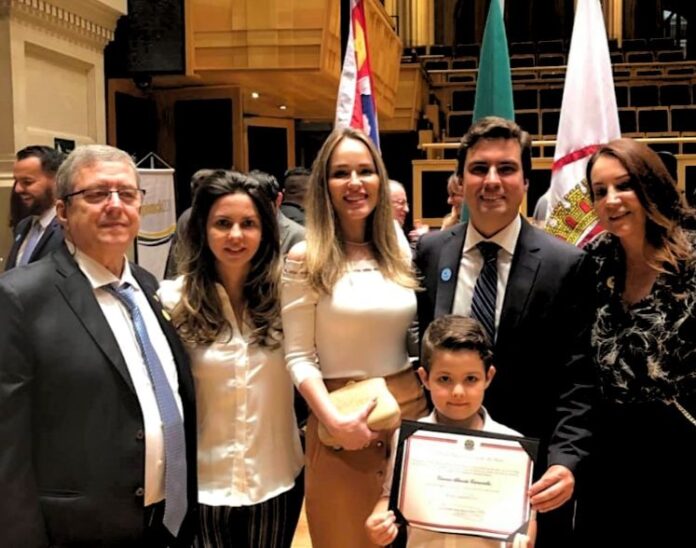 - Vinícius com a noiva, ao lado da mãe, do irmão e do pai, o ex-deputado Abelardo Camarinha, na diplomação em 2018 (FOTO: Divulgação)
