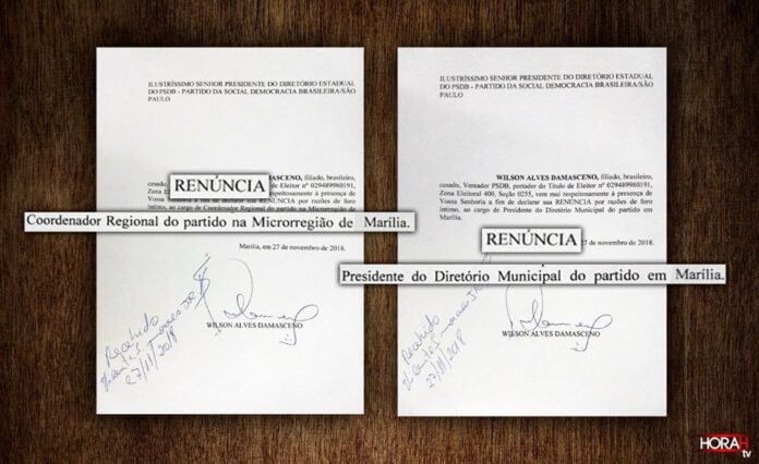 (FOTOS: Divulgação – Os documentos de renúncia de Damasceno, evidenciando ainda mais o racha entre os tucanos em Marília)