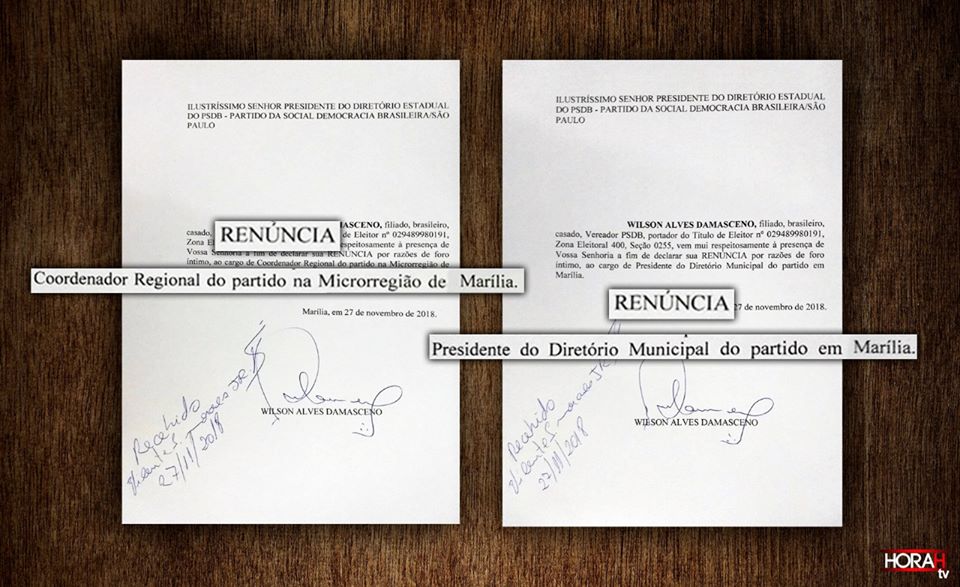 Vereador e presidente da Câmara, delegado Wilson Damasceno renunciou à presidência do Diretório Municipal do PSDB e da Coordenadoria Regional do partido. Os documentos foram recebidos por Vicente Moraes Jr, que é membro da Executiva municipal, e estão datados desta 3ª feira (27). Nos dois casos, Damasceno alega “razões de foro íntimo”.
