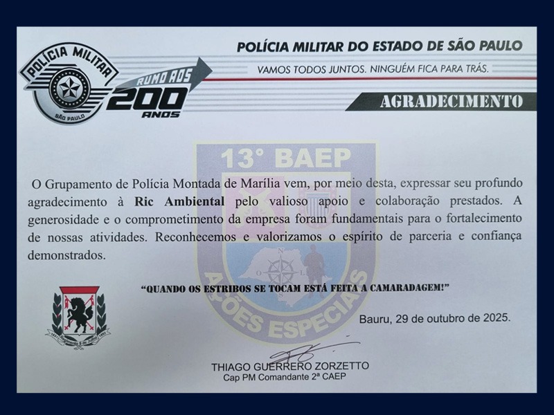 A RIC Ambiental participou, na manhã da última quarta-feira (29/10), da solenidade em comemoração aos 40 anos do 13º Batalhão de Ações Especiais de Polícia – BAEP, em Marília. Durante o evento, a concessionária recebeu uma homenagem especial em reconhecimento ao apoio prestado na reforma do estábulo do efetivo de cavalos do batalhão, uma ação que visa trazer melhores condições sanitárias e estruturais para os animais utilizados nas operações policiais e em eventos comunitários.