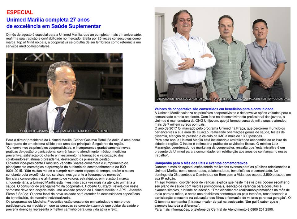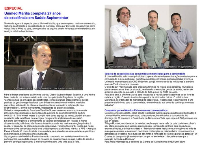 MaríliaSAIBA MAIS sobre os 27 anos da Unimed Marília e a excelência dos serviços oferecidosPor Rosangela Martins Medeiros - 15/08/2018 - 18h49