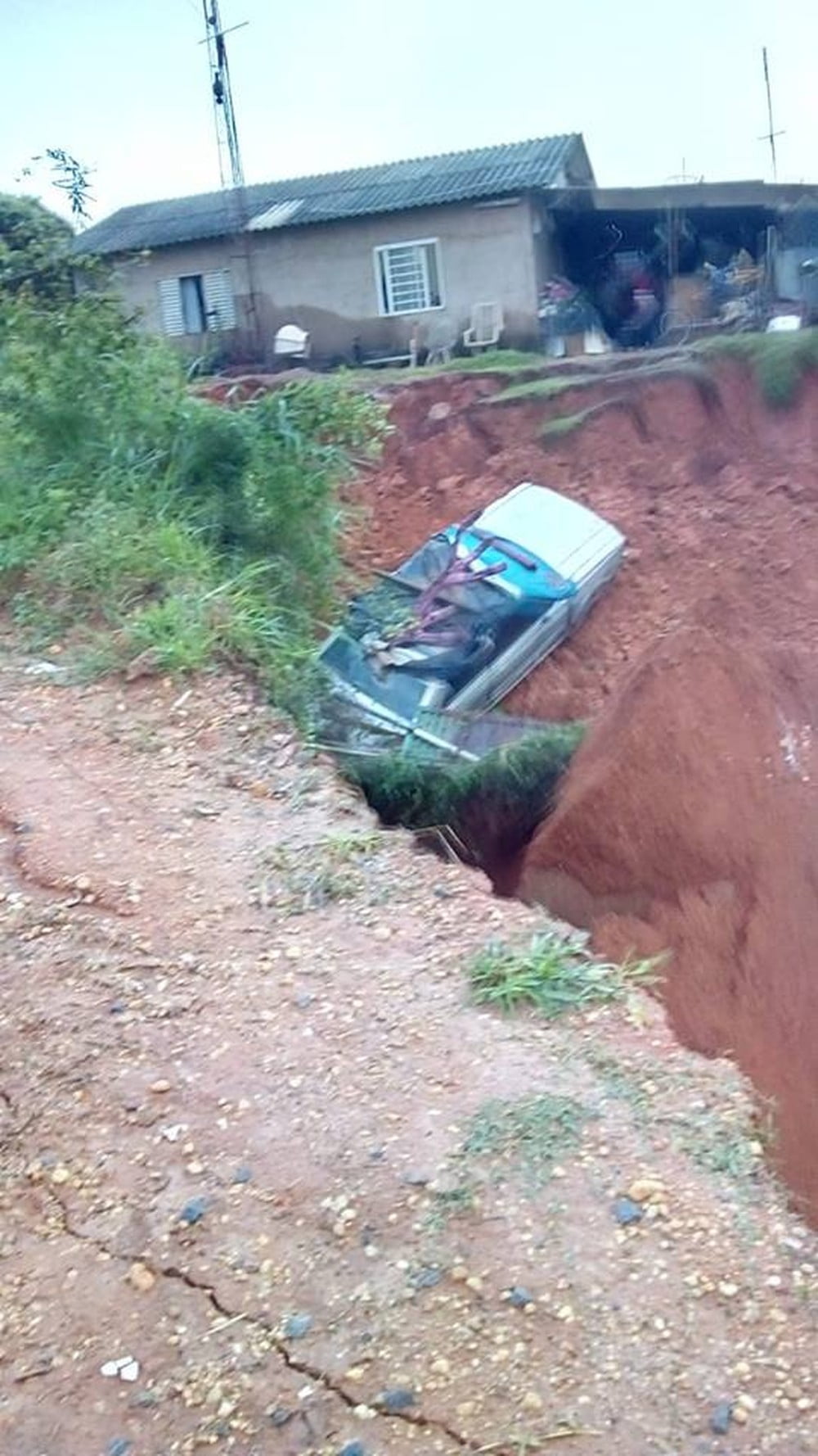 - Carro foi parar no fundo da cratera, que também ameaça desmoronar casas na vizinhança (FOTO: Arquivo Pessoal/Reprodução TV Tem)
