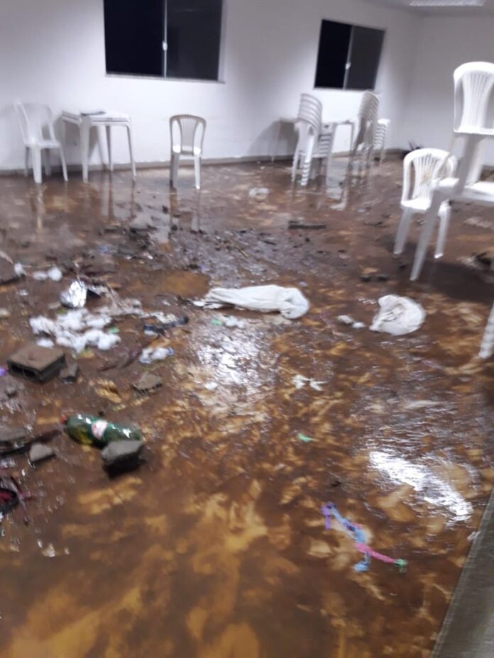 - Salão de festas de condomínio foi invadido pela água e lama (FOTO: Luís Salvelli/Reprodução)