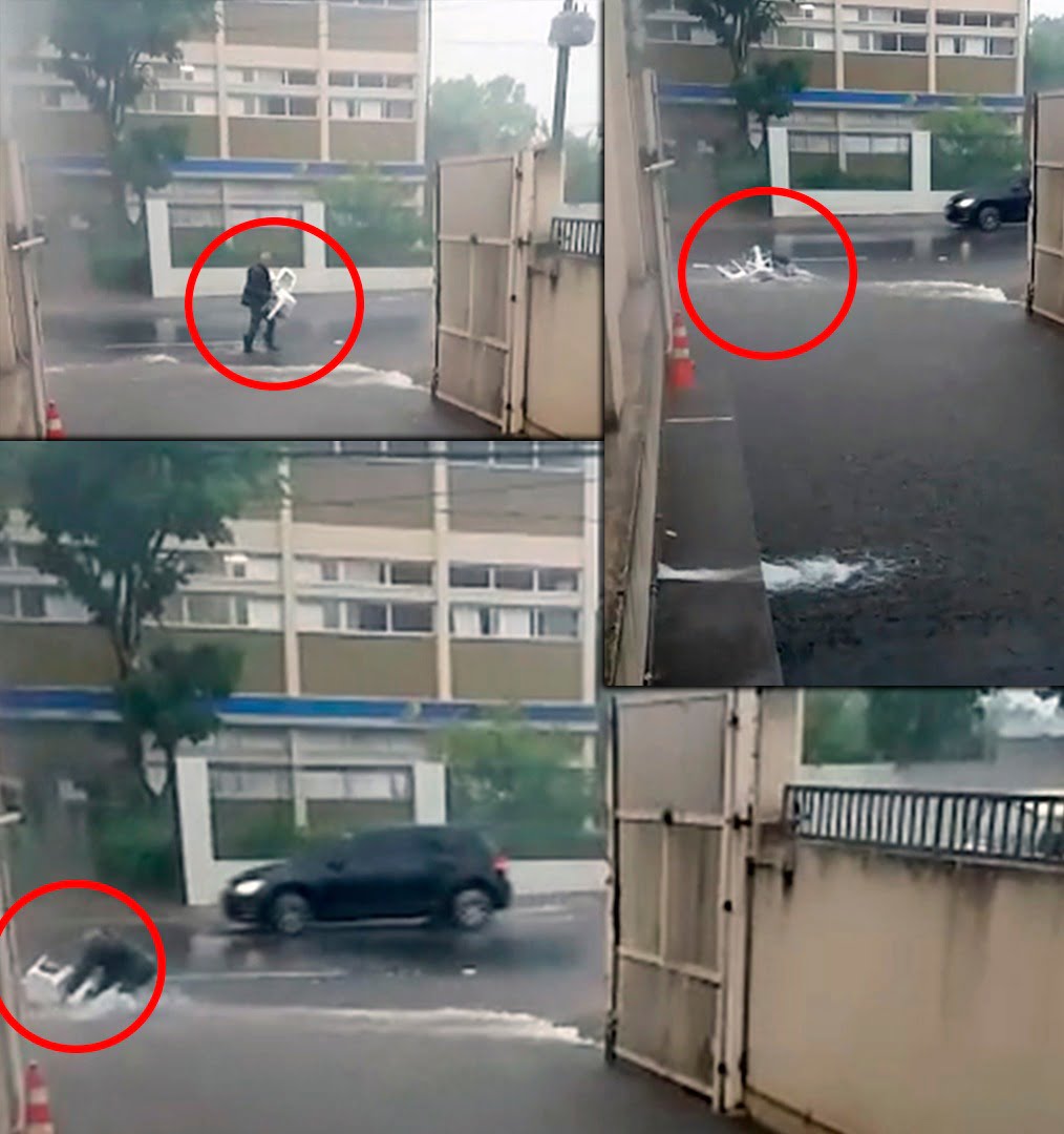 - Homem quase foi arrastado pela enxurrada para não deixar cadeira ser levada pela ventania (IMAGENS: Cristian Verstapen/Reprodução)