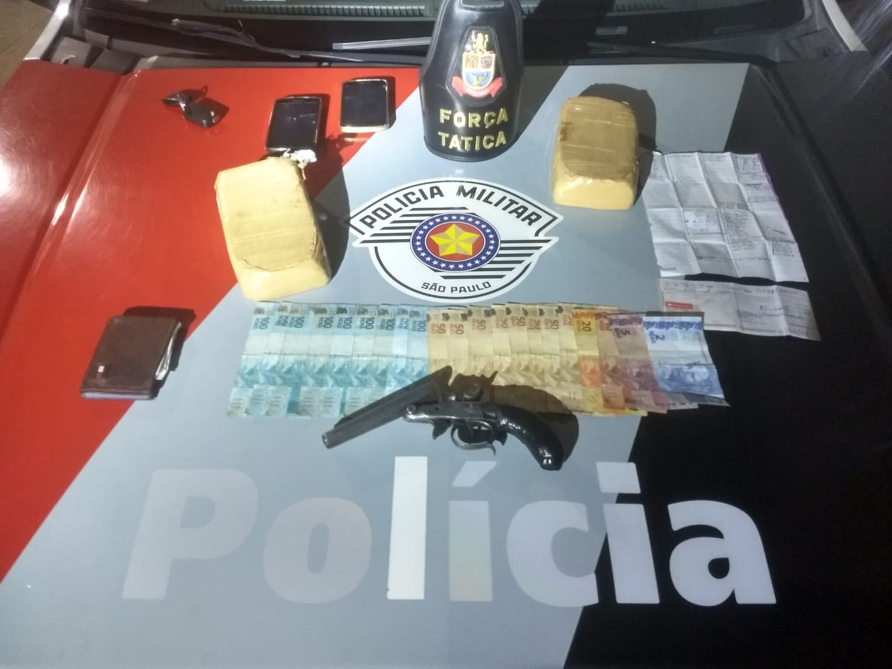 CRACK – 2 kg de crack, avaliados em R$ 40 mil, uma garrucha calibre 38 e R$ 1,3 mil em dinheiro e R$ 3 mil em cheque foram apreendidos pela Força Tática da PM na 5ª feira (30), durante operação na Zona Sul. Os PMs notaram 2 homens muito nervosos e incomodados dentro de um Gol, onde a droga foi encontrada. Foram presos R.N.B., 32 anos, e D.J.S., 22.