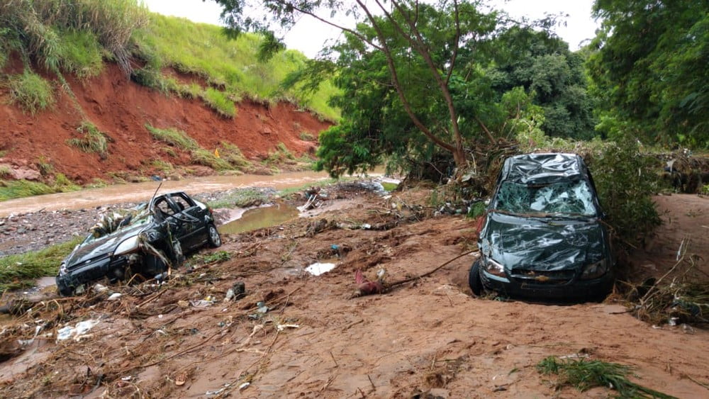 - Força da enxurrada arrastou carros para dentro de córrego; mãe e filha estavam no carro à direita, ficaram presas às ferragens e morreram afogadas (FOTO: TV Tem/Reprodução)