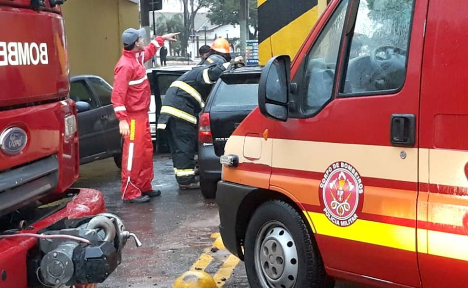 (FOTOS: João Trentini/Reprodução – O carro teve a frente destruída com o impacto; Corpo de Bombeiros socorreu a grávida)